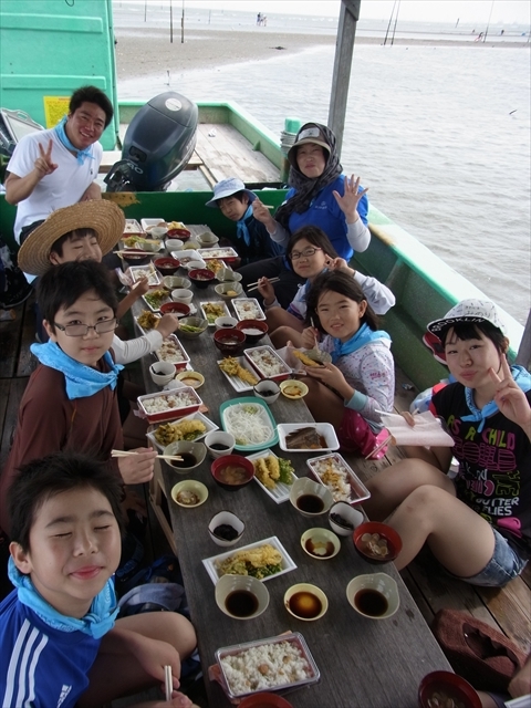 この日のメニューは、あさりご飯、あさりの味噌汁、ダツと野菜の天ぷら、タイのお刺身、海苔の酢の物、カレイの煮付け。みんな満腹になりました。