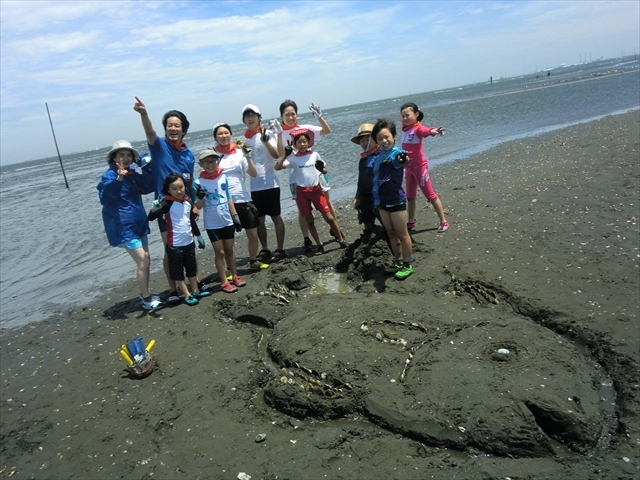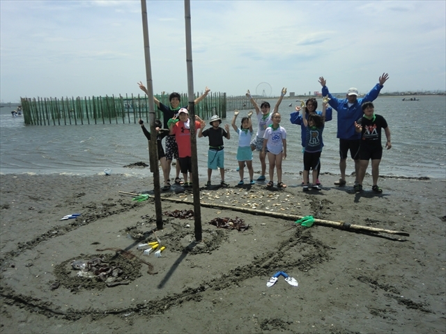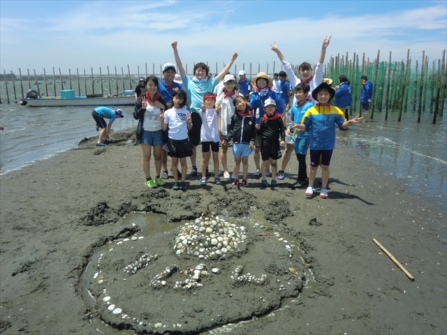 潮が引いている間は船は動けませんので、潮が満ちてくるまでの間、各班に別れて砂を使って造形する「砂アート」大会を開催。
