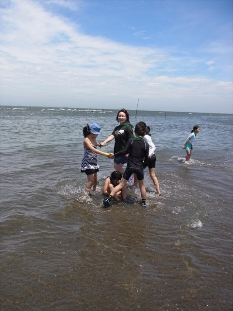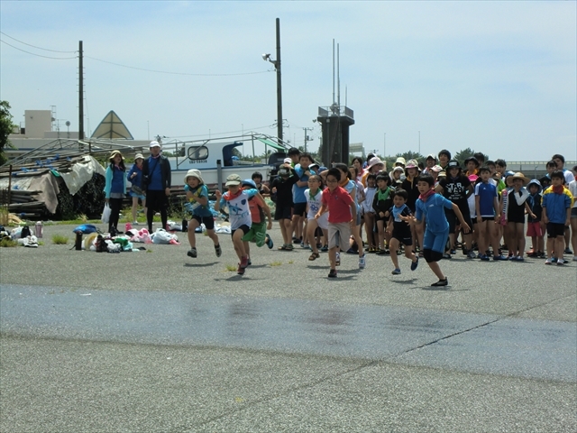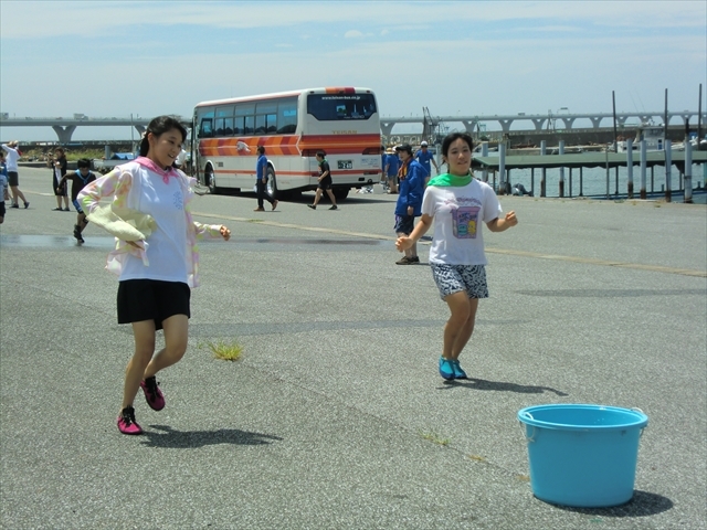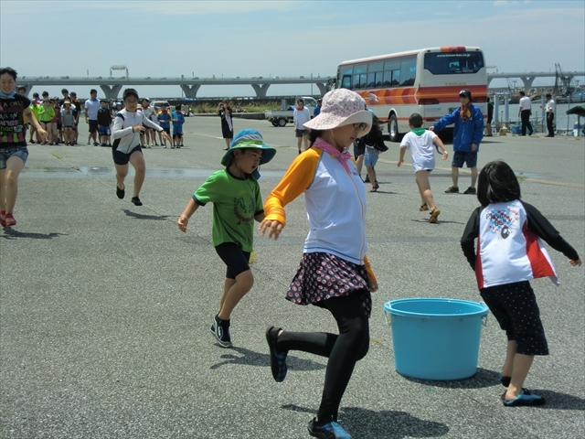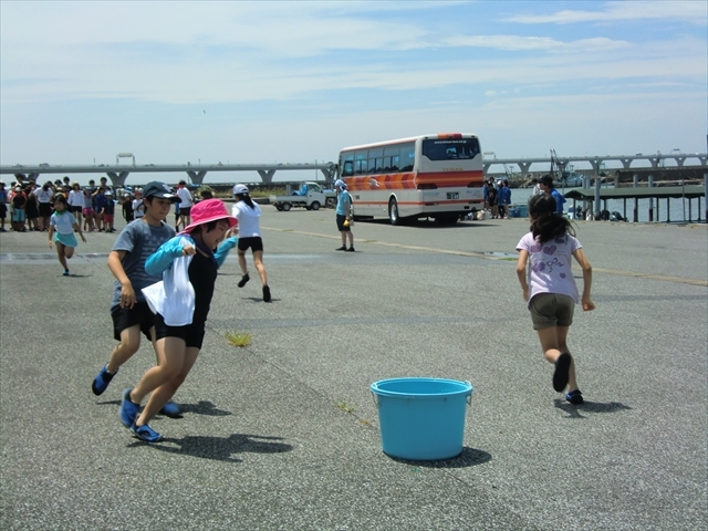 港に戻り、水で砂を洗い流したあと、バスの出発までちょっとだけ時間に余裕があったので、「しりとりリレー」を開催。と言いつつ、本当は「バスに乗る前に濡れた衣服と足を乾かしちゃおう」という目的もあったのですが、あまりにエキサイティングし過ぎて、途中で頭から水をかぶってクールダウンする子も.....また元通りのビショビショに。