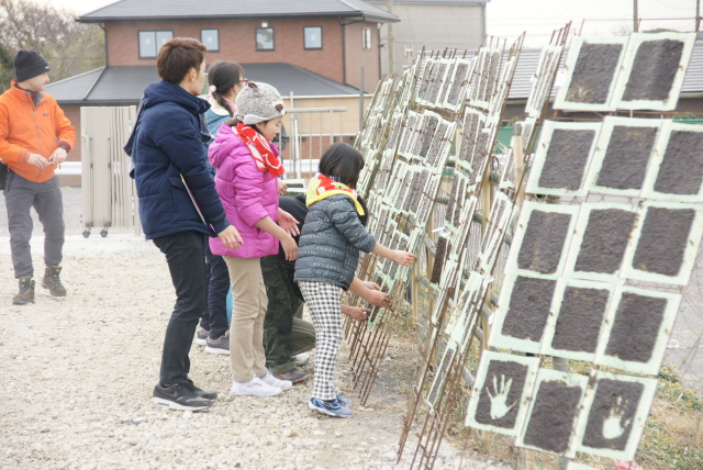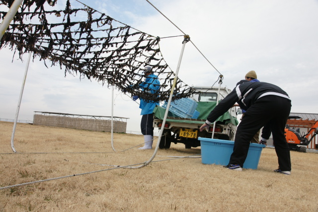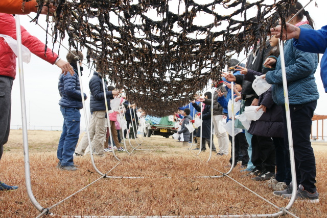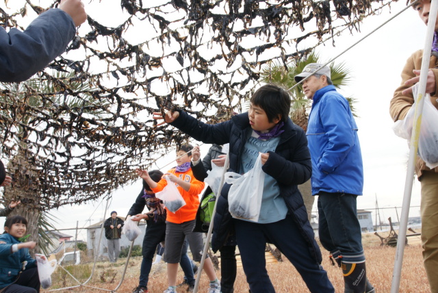 ※『海苔摘み』は通常なら海の中で行う作業との事ですが、今回は前日に網を回収しておいて頂き、陸で体験できるようにセッティングしてくれています。