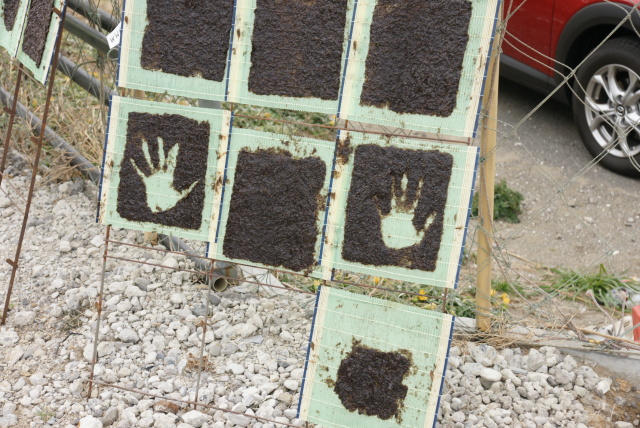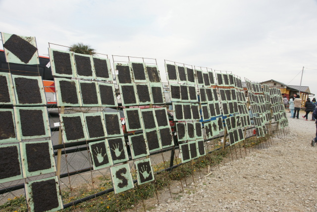 続いて『海苔摘み』の体験。さっきの「海苔すき」に使っていた海苔の液体は、この網から摘んだ海苔を細かく刻んで水に入れていたものです。