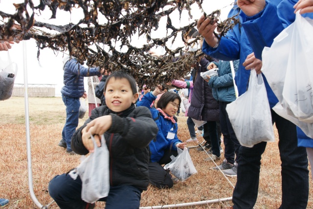 まずは、ひとつかみ摘んで食べてみました……すると「海の味!!」「固〜い!!」「昆布みたい!!」と、いろんな感想が飛び交っていました。そして、いよいよ「摘み取りタイム」。大森氏の『開始!!』の合図に合わせ、子どもたちが一気に摘み取りました。